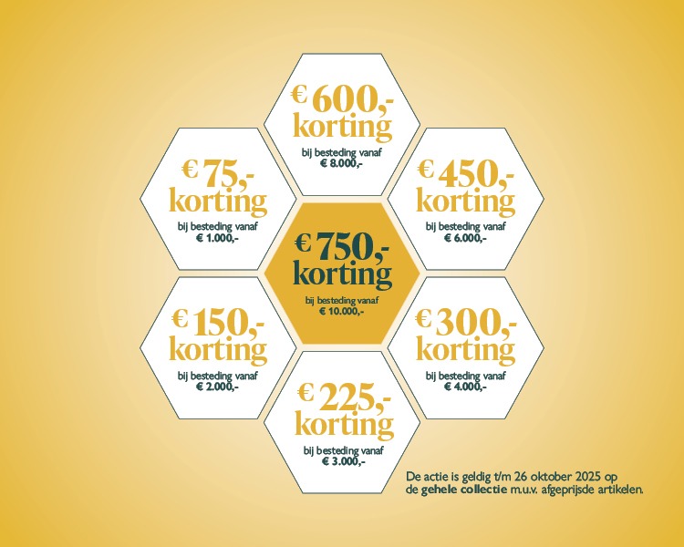- De stapelkorting geldt bij een minimale besteding van €1.000,- (exclusief bezorgkosten) en loopt op tot een maximale korting van €750,- bij een besteding van €10.000,- (exclusief bezorgkosten).